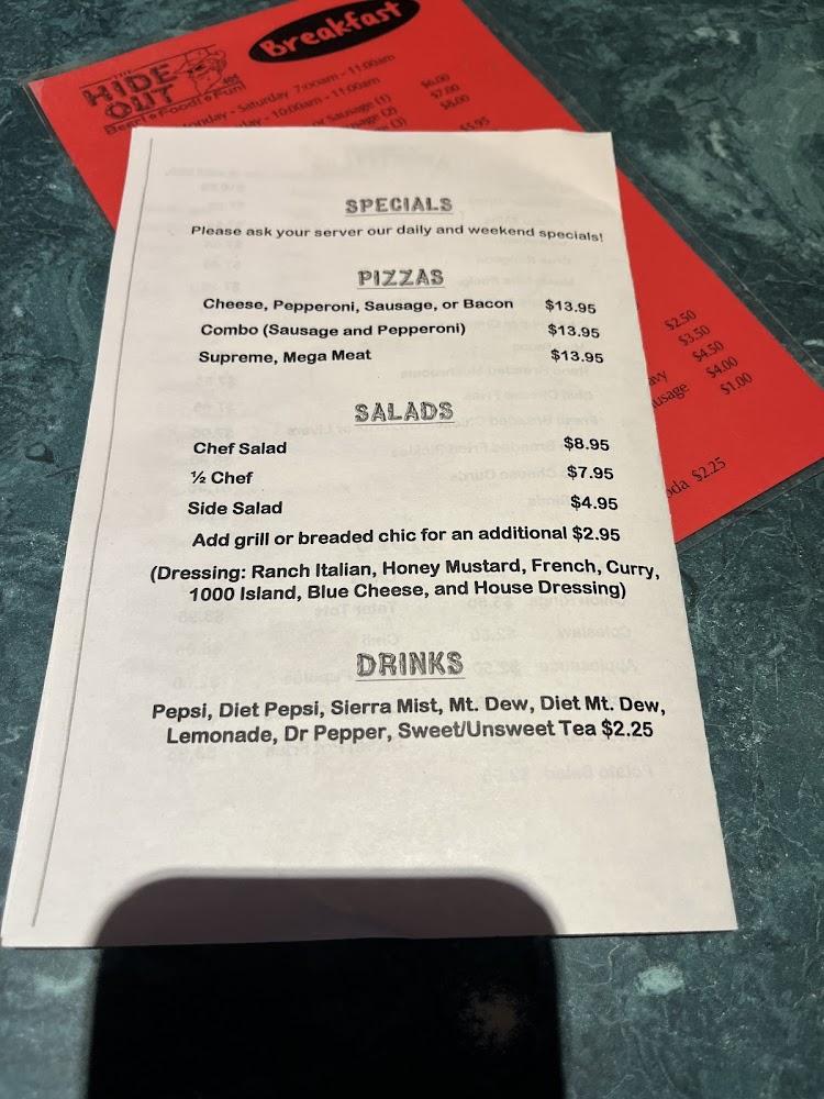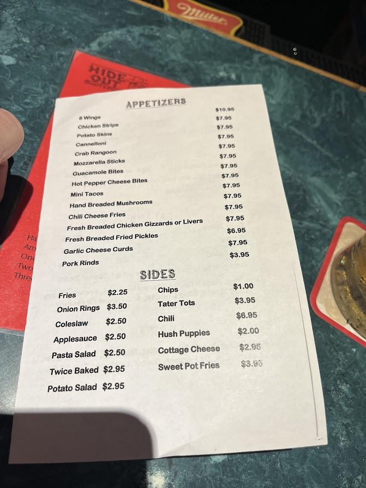 The menu at The Hide Out features a variety of comforting dishes. Start with appetizers like crispy chicken strips or crab rangoon, ideal for sharing. For main courses, options vary from pizzas to hearty salad choices. The specials, including battered pickle chips, entice many guests. Banana Pudding is a delightful dessert that completes a meal nicely. Drinks include a solid selection of craft beers and cocktails, perfect for winding down after a long day. Happy hour specials add value, making this restaurant both enjoyable and affordable.